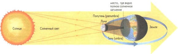 Во время солнечного затмения Луна проходит между Солнцем и Землей и бросает тень на Землю. Затмение бывает полным лишь в области густой тени, создаваемой Луной.