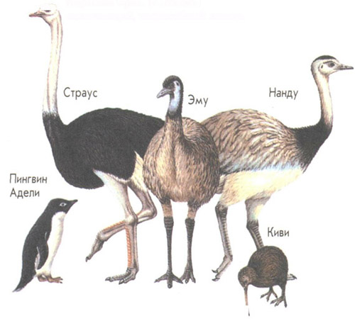 Всех этих птиц объединяет одна необычная особенность: они не умеют летать. Самая крупная из всех птиц - страус. Пингвин Адели может стоя выпрямить спину и умеет плавать. Эму родом из Австралии, нанду из Южной Америки. Киви - ночная птица из Новой Зеландии.
