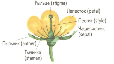 Внутри цветка (flower) располагаются мужские органы, называемые тычинками (stamen), и женские - рыльца (stigma). Тычинки покрыты пыльцой (pollen), оплодотворяющей рыльце, из которого образуется плод.