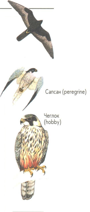Соколы, как и ястребы (hawks), считаются дневными хищными птицами и распространены по всему миру. Соколы быстро летают и ловят свою добычу когтями, пикируя на нее сверху. Крупным крючковатым клювом они разрывают плоть. Сапсан (Peregrine falcon) - один из самых быстрых летунов на свете. В пикировании его скорость может достигать 280 км/ч.