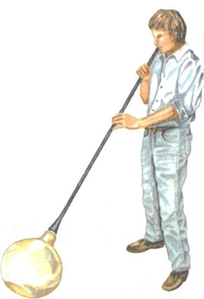С помощью традиционного способа выдувания из комка расплавленного стекла получается пузырь, которому придают нужную форму.