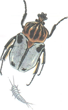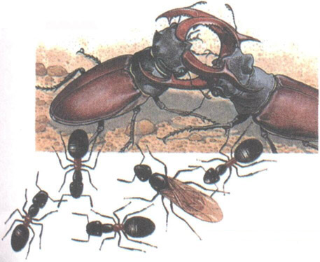 Самец африканского жука-голиафа может весить более 100 г. Рядом с ним чешуйница, примитивное бескрылое насекомое. Большая часть насекомых, подобно пчеле, имеет четыре крыла, однако мухи обходятся только двумя. Насекомые дышат через крошечные отверстия, называемые дыхальцами и расположенные по бокам их тела.