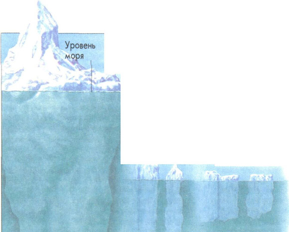 При замерзании объем воды увеличивает ся, и поэтому плотность ее уменьшается. Вот почему айсберга (icebergs) плавают, хотя около 7/8 объема этих ледяных гор остается под поверхностью. Некоторые из антарктических айсбергов имеют длину более 100 км.