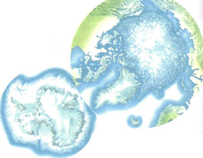 Антарктический ледяной щит (вверху слева) прикрывает сушу. Поверхность Северного Ледовитого океана покрыта полями паковых льдов.