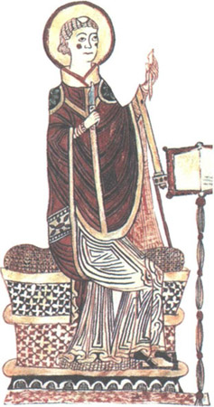 средневековой иллюстрации изображен Беда Достопочтенный, монах из Ярроу, Англия. Подобные рисунки обычно украшали рукописные Библии и другие религиозные книги.