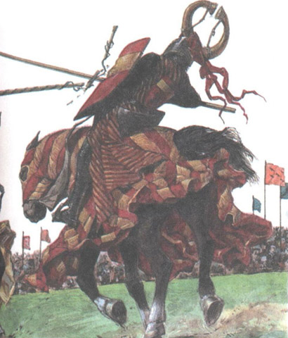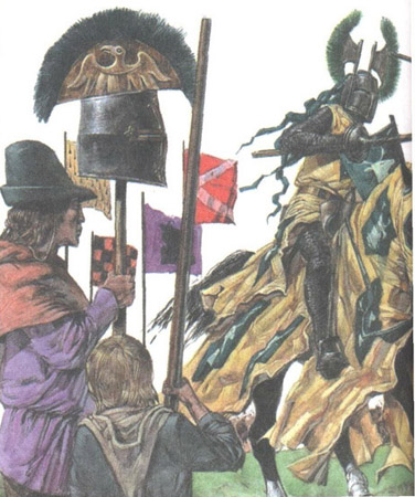 Рыцари, съезжающиеся на турнир. Они пользовались тупыми мечами и пиками, однако многие все равно погибали.