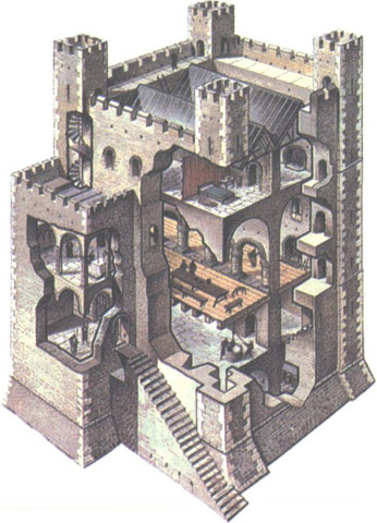 Главная башня (донжон) замка представляла собой массивное сооружение, самое надежное укрепление в замке. Она стояла во дворе, называемом "бейли" (bаilу). В главной башне размещались помещения для гарнизона, большой зал и покои владельца замка.