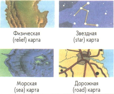 Различные типы карты (mар). На физической (relief) показана поверхность суши, гор, реки, леса и др. Карты морского дна необходимы для прокладки курса корабля и при добыче полезных ископаемых. Звездные карты помогают ориентироваться, но самые распространенные, наверное, карты дорог.