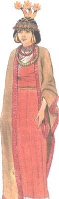 Шумерская царевна в пышном головном уборе, серьгах и ожерелье из серебра и золота, украшенных синим лазуритом и красным сердоликом.