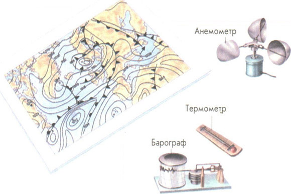 Одной из главных обязанностей метеоролога является предсказание погоды. Метеорологи пользуются самыми разными приборами. Анемометр (anemometer) измеряет скорость ветра. Барограф (barograph) записывает атмосферное давление.