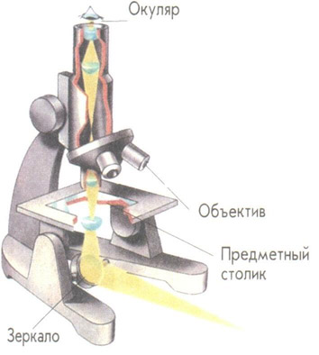 Изображение образца, находящегося на прозрачном столике микроскопа, увеличивается объективом и рассматривается с помощью окуляра.