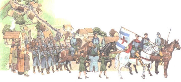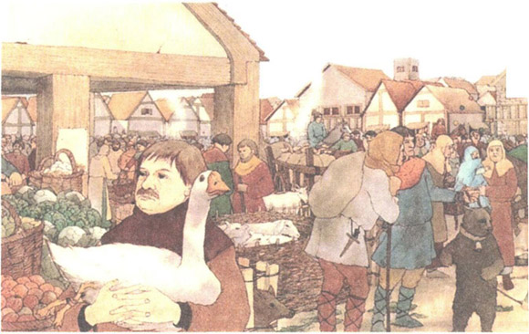 Средневековый европейский город в базарный день становился шумным и людным. Толпу развлекали даже пляшущие медведи.