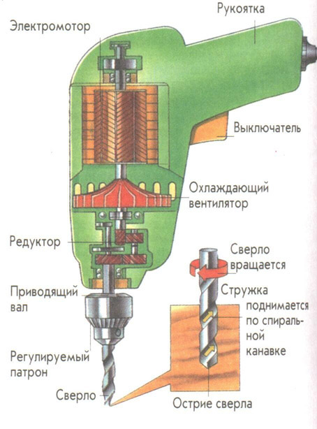 Маленький электромотор дрели очень силен. Замедление вращения сверла с помощью шестерен увеличивает его мощность.