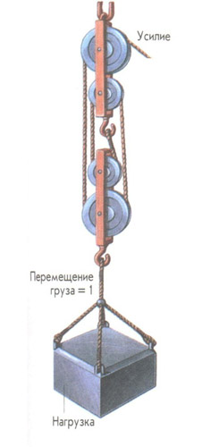Блоки изменяют направления действия силы. Полиспаст состоит из нескольких блоков, облегчающих подъем. Небольшому перемещению груза соответствует много большее перемещение веревки.