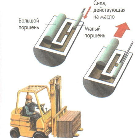 Автопогрузчик - это гидравлическая машина. В нем энергия передается через давление жидкости, потому что жидкости несжимаемы. Внутри гидравлического цилиндра большое перемещение малого поршня вызывает незначительное передвижение большого.