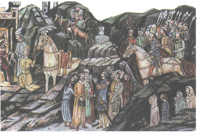 Первоначально венгры жили в степях Восточной Европы. Под предводительством князя Арпада они захватили нынешнюю территорию Венгрии в IX в. Эта взятая из рукописи иллюстрация изображает их появление в Венгрии.