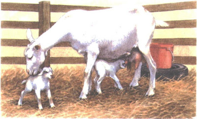 Козленок сосет козу. Млекопитающие являются наиболее высокоразвитыми среди животных. Все млекопитающие рождают детенышей, которые питаются сначала молоком, выделяющимся из сосков матери. У млекопитающих обычно четыре конечности.