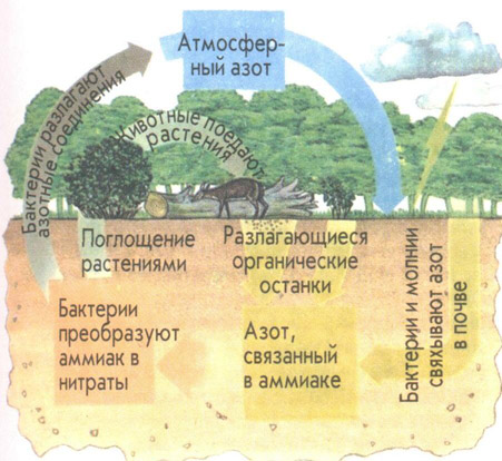 Круговорот азота: азот переходит из воздуха в почву, в растения, в животных, которые едят растения, и возвращается обратно в воздух.