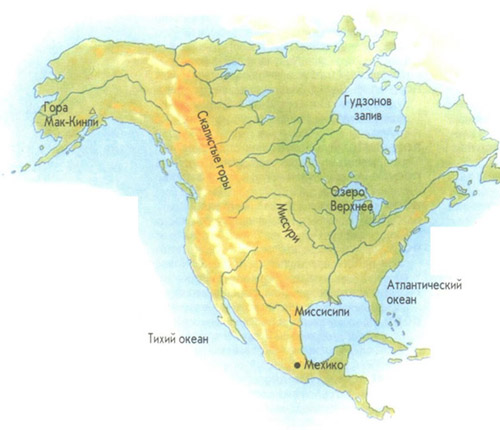 Континент Северная Америка простирается от тропической Панамы до холодного Северного Ледовитого океана, а с востока и запада берега его омывают Атлантический и Тихий океаны