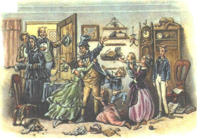 Романы Чарльза Диккенса часто издавали с иллюстрациями; они публиковались частями в журналах. Здесь показана сценка из романа "Дэвид Копперфильд".