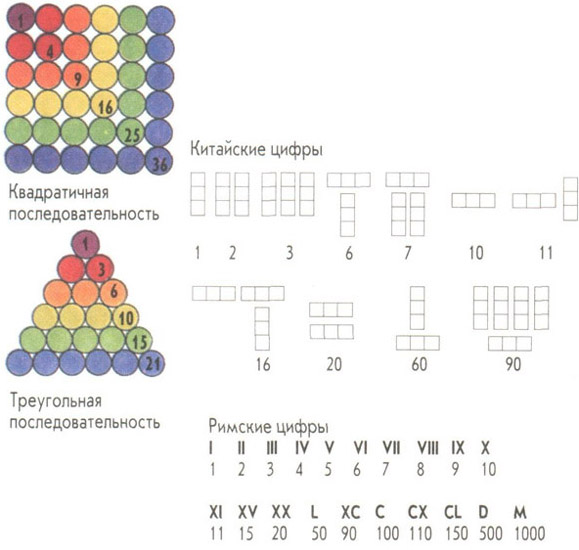 Некоторые численные последовательности можно представить схематически. Произведение числа на само число называется квадратом (вверху). Треугольная схема задает арифметическую последовательность 1,3, 6,10,15, 21 и т. п.
