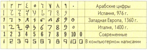 Наши современные цифры возникли из арабских. В отличие от многих древних систем, мы пользуемся нулем, означающим отсутствие. Используя цифры от 0 до 9, можно записать любое мыслимое число. Слово digit, цифра, происходит от латинского digitus. означающего "палец".