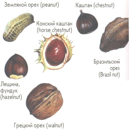 Ядра многих орехов вкусны и богаты белками и жирами. Из арахиса можно приготовить арахисовое масло, а муку из каштанов добавляют в хлеб.