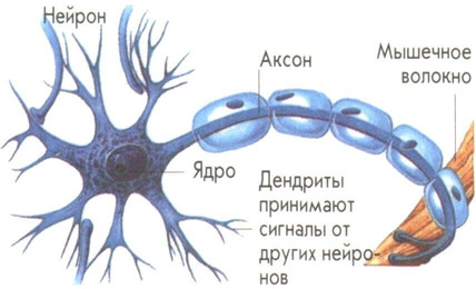 Нервная клетка, или нейрон, - центр управления мышечным нервом. Информацию передает аксон, похожий на трубочку вырост.