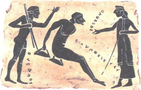 Перед вами греческий прыгун в длину. Обратите внимание на тяжелые грузы в обеих его руках.