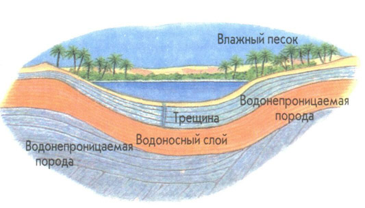 Оазис возникает там, где водоносный слой несет воду, которая может выбиться на поверхность. Если вода заключена между двумя скальными пластами, можно бурить колодцы.