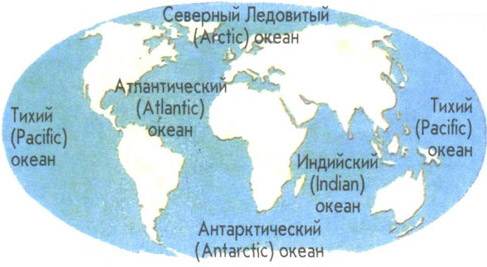 ocеаn сущ. океан, одно из четырех огромных водных пространств, покрывающих большую часть поверхности Земли: Атлантический, Индийский, Тихий, Северный Ледовитый океаны. Иногда выделяют пятый океан -Антарктический, объединяя в него воды, омывающие Антарктиду. - прил. oceanic океанический.