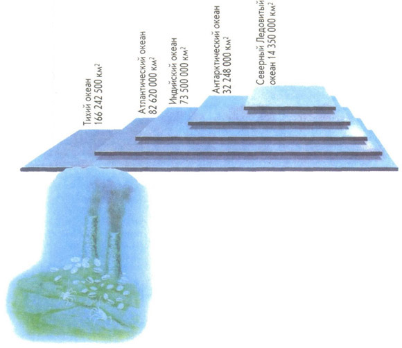 Самый большой океан (ocean) мира -это Тихий. По площади он в два раза больше Атлантического океана и гораздо глубже. Значительная часть тихоокеанского побережья занята горными хребтами, такими, как Анды. Поэтому в Тихий океан впадает мало крупных рек. В Атлантический океан их вливается куда больше.