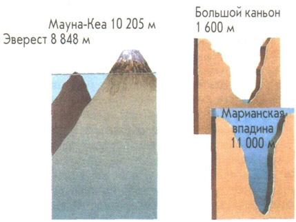 Океанические горы очень высоки. Мауна-Кеа (Гавайи), если мерить от морского дна, много выше Эвереста. И, конечно же, Большой Каньон просто карлик по сравнению с Марианской впадиной.