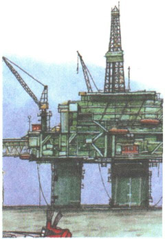 В вышке на нефтедобывающей платформе располагается буровое оборудование. Установленный на конце бурильной колонки бур сверлит в горных породах отверстие с помощью металлических зубцов.