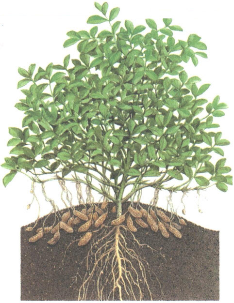 Земляной орех, или арахис, растет под землей. Ядрышки его покрыты красной кожицей и находятся в желтоватых морщинистых стручках.