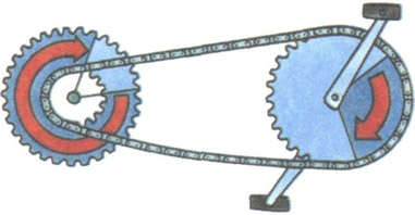 Педали велосипеда соединены цепью с задним колесом. Поворачивая педали, ты поворачиваешь заднее колесо и двигаешь велосипед вперед.
