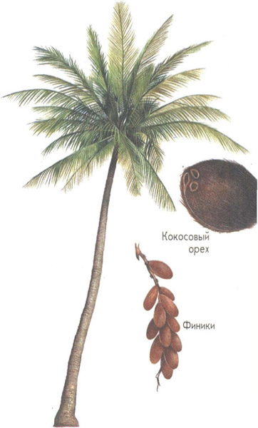 Кокосовая пальма вырастает до 30м в высоту. Финики -это плоды финиковой пальмы. Почти все пальмы растут в странах с теплым климатом.