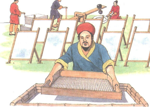 Бумага была изобретена в Китае при династии Ханъ (206 до н. э-220 н. э.). Рамки с рубленой коноплей выставлялись сушиться на солнце.