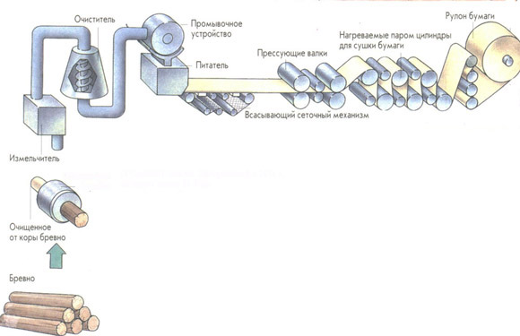 Современный процесс изготовления бумаги: обдирочный барабан снимает кору со специально обработанных бревен, превращая ее в пульпу, жидкую водяную кашицу. Далее пульпа поступает на проволочную сетку; вода вы текает, а бумажный лист прокатывается между валиками.