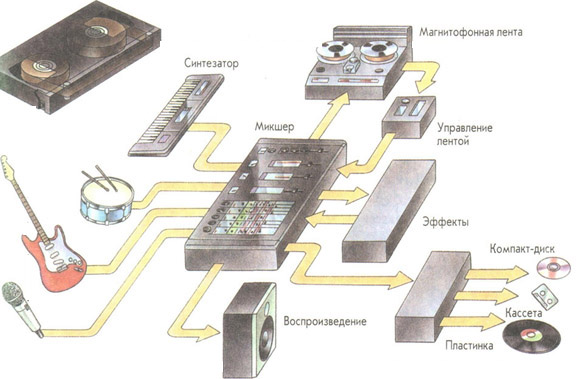 Люди научились записывать (record) звук в 1870-е гг. Сегодня радио, магнитофон и компакт-диск стали частью нашей повседневной жизни. На иллюстрации показана новейшая система звукозаписи. Звуки можно изменять с помощью электроники. Оптическим цифровым кодированием электронных импульсов устраняется "шипение", присущее более старым методам записи звука.