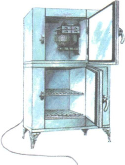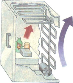 Электрический холодильник: жидкость, называемая хладагентом, испаряется в змеевике внутри холодильного отделения, поглощая тепло и снижая температуру. Пар сжимается насосом и вновь превращается в жидкость. Потом она выделяет в комнату тепло, поглощенное в холодильном отделении.