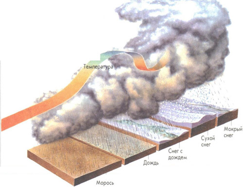 В основном дождь получается из снежинок, тающих при падении. Поднимающиеся кверху водяные пары охлаждаются и конденсируются в водяные капли, образующие облака. Выше уровня замерзания капли превращаются в ледяные кристаллы, из которых образуются снежинки.