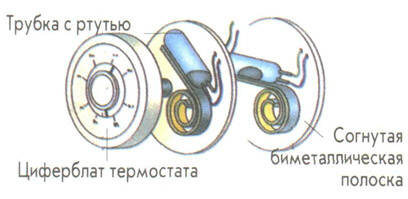 Многие термостаты содержат биметаллическую полоску, сделанную из двух соединенных сваркой металлических лент. За счет различия их коэффициентов расширения полоска при нагреве изгибается. Электрическая цепь замыкается каплей ртути, находящейся внутри трубки. При изгибе полоски трубка наклоняется, капля откатывается и размыкает контакт.