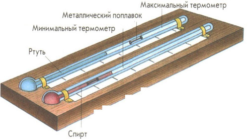 Термометр для измерения максимальных температур наполнен ртутью. При нагреве ртуть расширяется, сдвигая вверх останавливающийся металлический указатель. Поплавок термометра для измерения минимальных температур (в нем используется спирт) останавливается на наименьшем значении температуры.