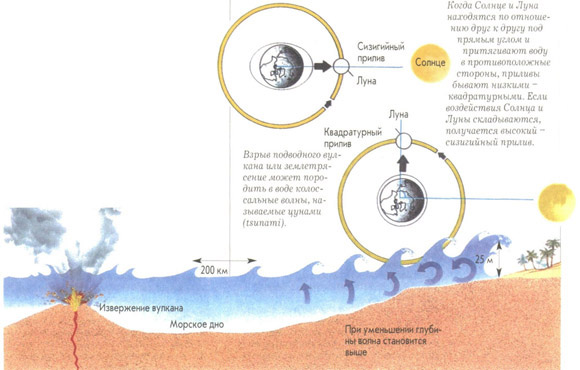 Самые высокие приливы (tides), сизигийные (spring), происходят, когда Солнце, Луна и Земл; выстраиваются по прямой линии. Самыми низки ми считаются квадратурные (neap) приливы, происходящие, когда Луна, Земля и Солнце располагаются под прямым углом друг к другу.
