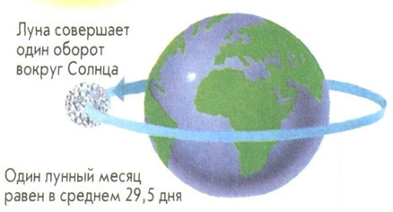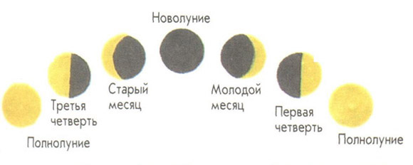 Время между двумя последовательными новолуниями составляет 29,5 дня. Новая Луна прибывает (waxes), и по совершении половины цикла мы видим Луну полной, целиком освещенной Солнцем. После этого Луна убывает (wanes).